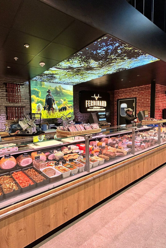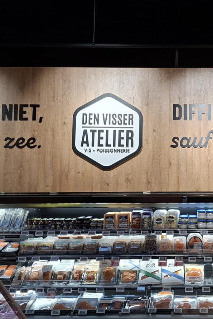 Delhaize Neerpede, un supermarché avec plusieurs ateliers : rôtisserie, boucherie, boulangerie, charcuterie,…